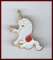 Novelty plastic button in the shape of a unicorn. Enameled in gold tone, white, and red. Self shank. Button measures