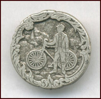 Cast pewter tone metal button depicting an old fashioned bicyclist. Each button measures 7/8 inch in diameter. Excellent condition. $8 (5 available) Order