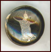 domed button depicting a costumed dancing lady. Metal loop shank. Button