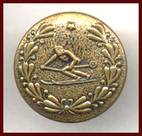 detailed silver tone button depicting a skier. Metalized plastic. Button
