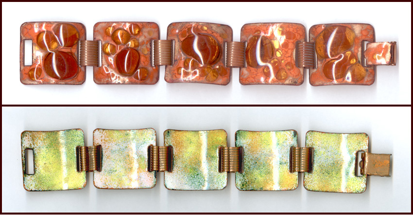 Gorgeous, heavily enameled, 5 link bracelet in a rich orange color with 3 dimensional glass "cookies" in a honey color. The back of the bracelet is fully enameled in speckled yellow, white, gold and green. Click here for a photo of the entire front and back. The bracelet measures 7 3/8 inches long by 1 1/4 inches wide. Excellent condition. $145 Order #J151225