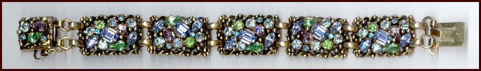 Gorgeous, sparkly, multi-colored rhinestone bracelet in shades of blue, green and lavender. Russian gold tone setting. Nice, tight, push-in clasp with additional safety chain. Marked on the clasp: "Barclay" in script. Bracelet measures 7 3/4 inches long and 3/4 inch wide. Some minimal wear to the plating on the back side only. Otherwise, the bracelet is in excellent condition. ON HOLD Order