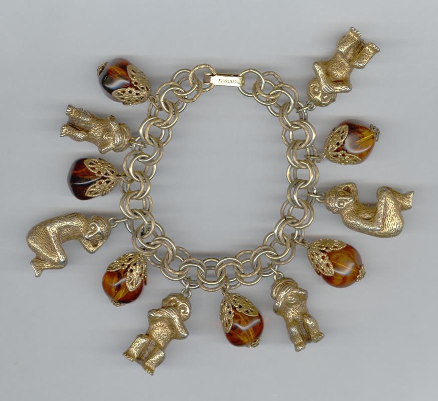 Novelty charm bracelet featuring 3 dimensional, gold tone monkeys depicting the concept of See No Evil, Hear No Evil, Speak No Evil. The monkey charms alternate with filigree capped, root beer color beads. Marked: "FLORENZA" on the fold over clasp. The bracelet measures 7 1/2 inches long. The bracelet has been restored by the replacement of the beads, which had deteriorated over time. I consider this piece a rarity as I have only seen a couple of examples in all my years of buying and selling costume jewelry. If monkeys are your thing, this bracelet may be for you! $245 ON SALE $195 Order