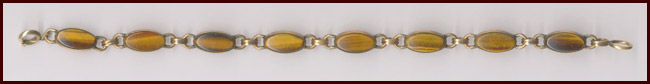 Charming, narrow bracelet made up of 8 links with golden tiger-eye cabochons in gold tone settings. Marked: "1/20 12K GF, WRE" for the W.E. Richards Co. of Massachusetts. The bracelet