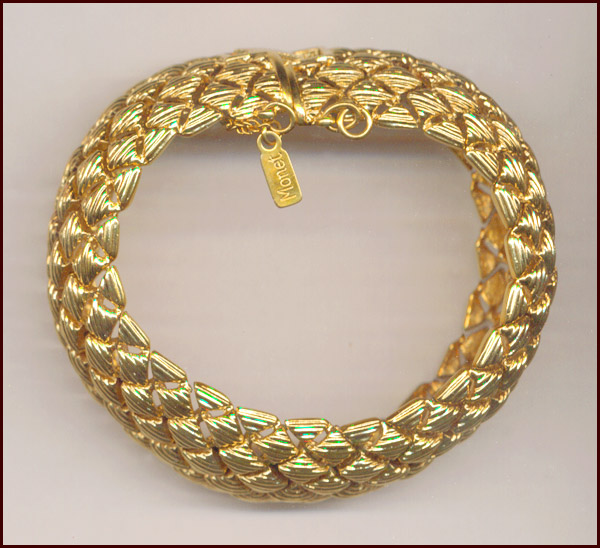 Well constructed, heavy weight, gold tone bracelet made up of textured, diamond-shaped links. Molds beautifully to the wrist. Safety chain. Marked: "MONET" on the clasp and on the hang tag. The bracelet