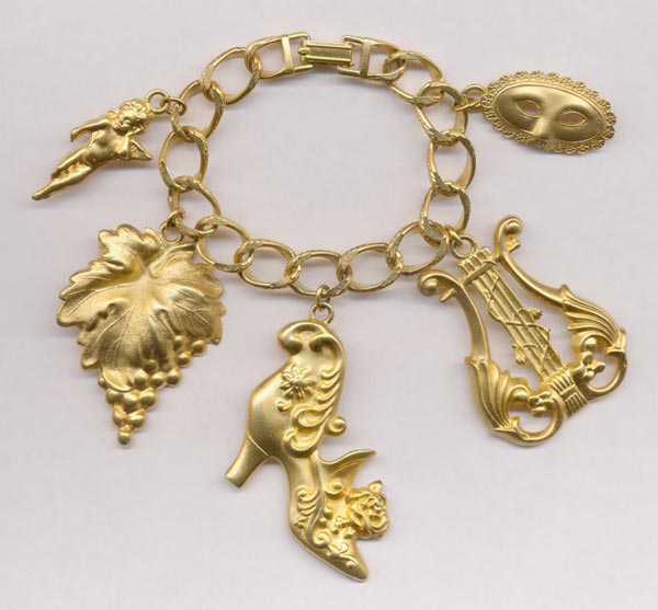 I have never seen a charm bracelet with larger charms than this one! For example, the shoe measures 2 1/2 inches long. The bracelet chain measures 7 3/4 inches long. Lovely, soft gold tone plating. All the charms are marked: "©KJL". Mint condition! $165 Order