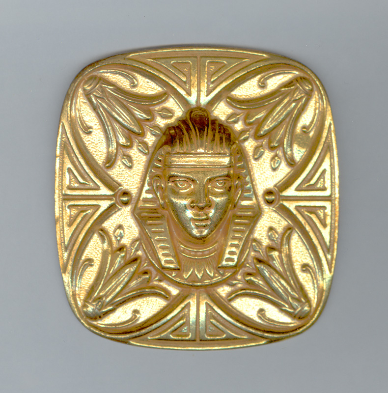 Huge, embossed metal, Egyptian Revival style pin featuring King Tut in the center surrounded by lotus blossom motifs. Rich, Russian gold tone finish. This piece was part of the Egyptian collection designed for Haskell by Larry Vrba in the 1970's. Pin measures 2 11/16 inches square. Marked: "MIRIAM HASKELL" on an oval cartouche on the back. Excellent condition. $125 Order #MiriamHaskellEgyptianPin