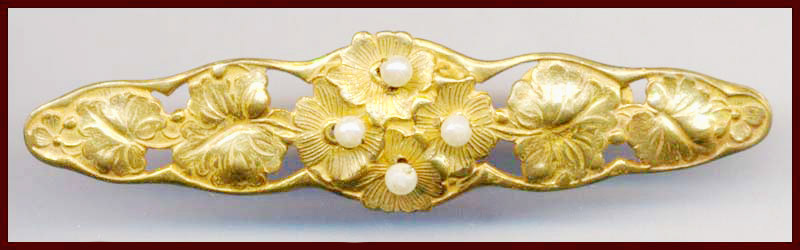Art Nouveau style floral bar pin, accented with small handwired faux pearls.