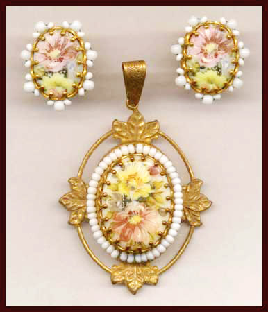 gold tone metal frame. Matching clipback/screwback earrings. Marked: "MIRIAM
