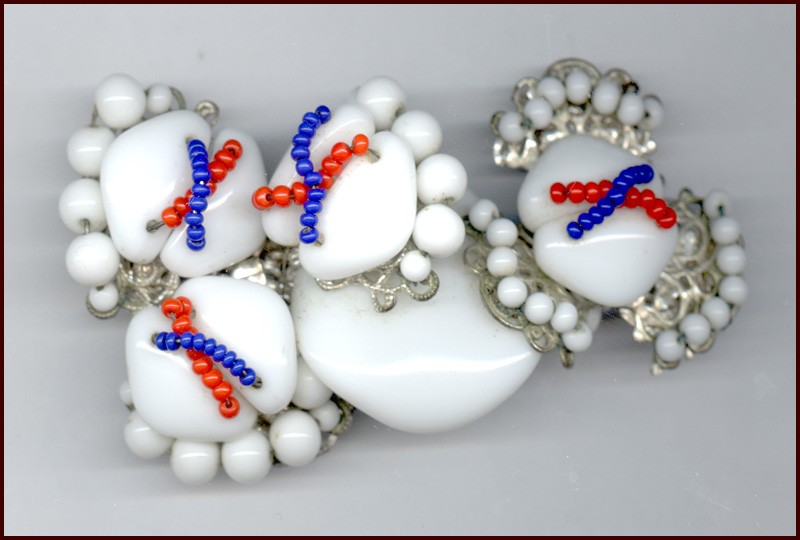 In all of my years buying and selling vintage costume jewelry I have never seen another Miriam Haskell piece like this one. It is a large, 3 dimensional pin made of white glass beads, accented with red and blue glass seed beads, mounted on silver tone filigree stampings. Nice, heavy construction. Marked on an oval cartouche: "MIRIAM HASKELL". Pin measures 3 1/4 inches by 1 3/4 inches. Excellent condition. An unusual piece for the Haskell collector. $98 Order #J30811